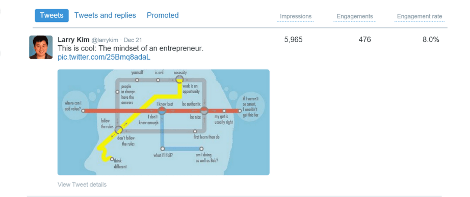 For example, Larry Kim, the founder of popular blogging platform Wordstream (acquired for $150M) and Mobile Monkey app randomly found an infographic fascinating and shared it on his Twitter account (as seen in the above picture). After that, he used Twitter analytics to find out the engagement rate of that tweet and discovered that it was 8%, usually more than his other tweets. As a result, Larry Kim ended up creating a write-up of the infographic and then published it in his column at Inc, that performed exceptionally well.