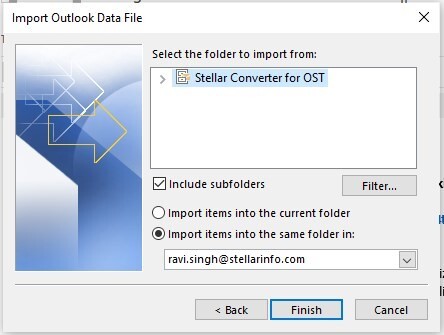 4. Select the folder items to import and the Outlook profile where you want to import the email items.