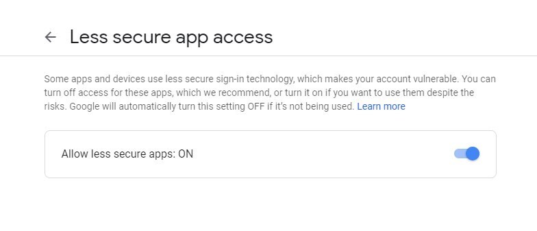 - Visit https://myaccount.google.com/lesssecureapps and allow ‘Less secure app access.’