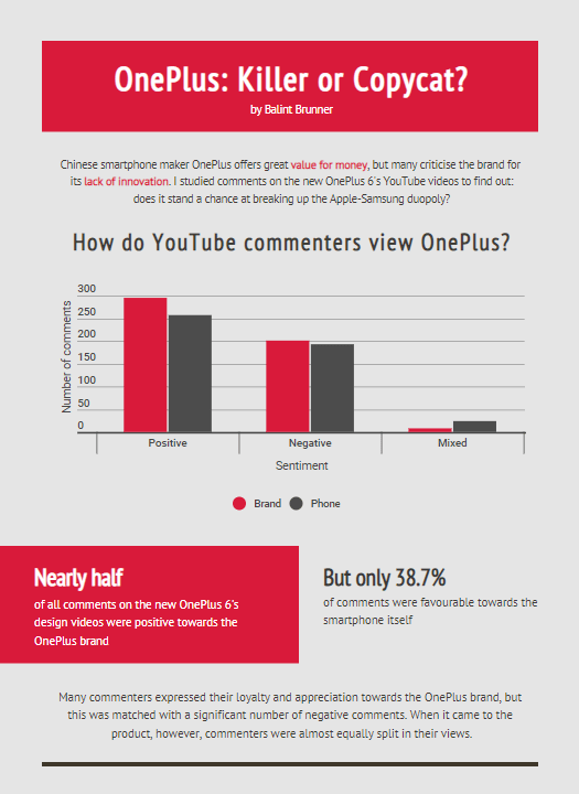 But how are these ‘copycat’ claims impacting on OnePlus’ reputation? Well, it seems that for the brand itself, they really are a cause for concern. My analysis showed there were twice as many negative references to the OnePlus brand as to the phone itself in relation to the copying of competitors. In other words, commenters went beyond claiming that the OnePlus 6 resembles an iPhone or a Galaxy, and either directly attacked the company’s strategy or expressed their disappointment with the entire brand.