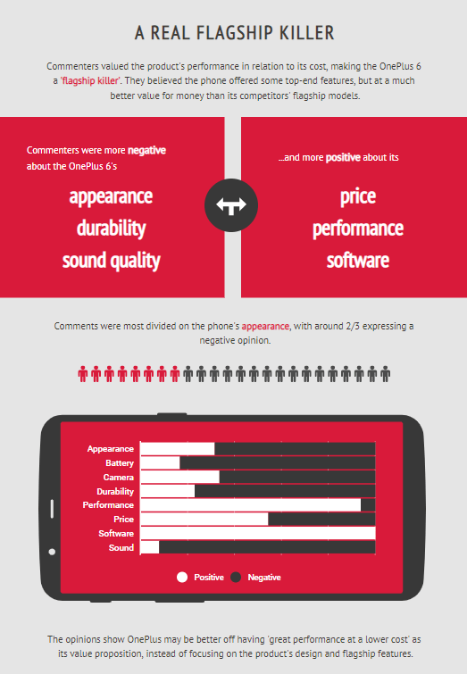 However, I’m confident there’s a way for OnePlus to maintain its status among the top-end market players while driving down negative views to a minimum. Commenters have been praising the OP6 for its price and performance, while the phone’s appearance, durability, and sound quality clearly weren’t their favorite aspects. This contrast puts OnePlus in a perfect position to demonstrate the value of their superior attributes and communicate it in a way that shows the company fully understands the customer’s priorities. So why not focus on ‘great performance at a lower cost’ as OnePlus’ value proposition, as opposed to churning out dozens of messages about the smartphone’s design and flagship features?