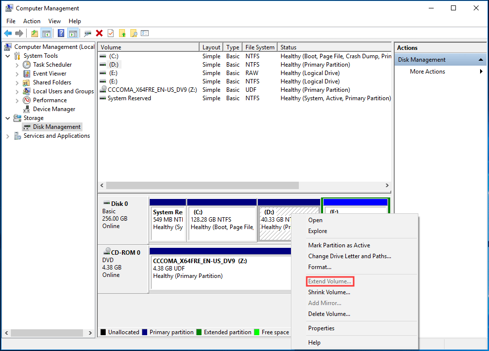 As the shortcut shows in below if you intend to combine partition D and partition F, you need to delete partition F to increase free disk space, and then, use Extend Volume feature to merge the two partitions.