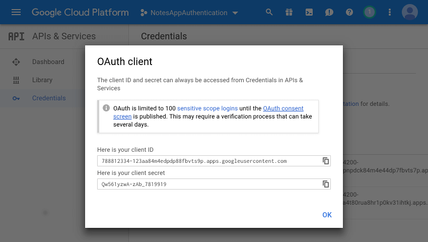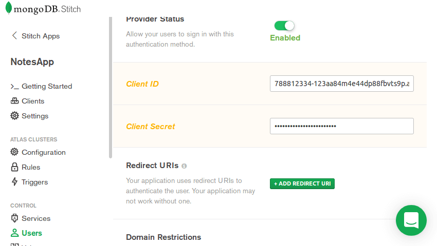 Now, when you click the Create button, you will see two strings – a client ID and a client secret. Note down both and navigate to Stitch admin console as shown in the screenshot below.