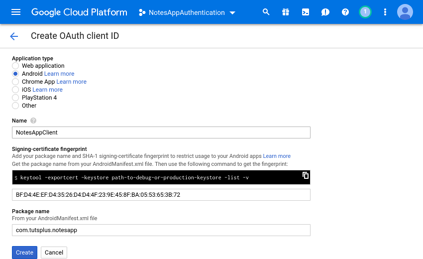 Here, you need to enter the name of the package for the Android app and SHA-1 fingerprint. For that purpose, open a terminal and run the following command: