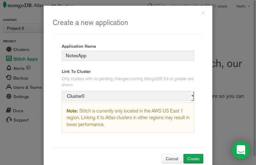 After moving to Stitch Apps section, press Create New Application button. Here, the app will ask you to give a name for your application. You also need to select one MongoDB cluster from the dropdown as shown in the screenshot below.