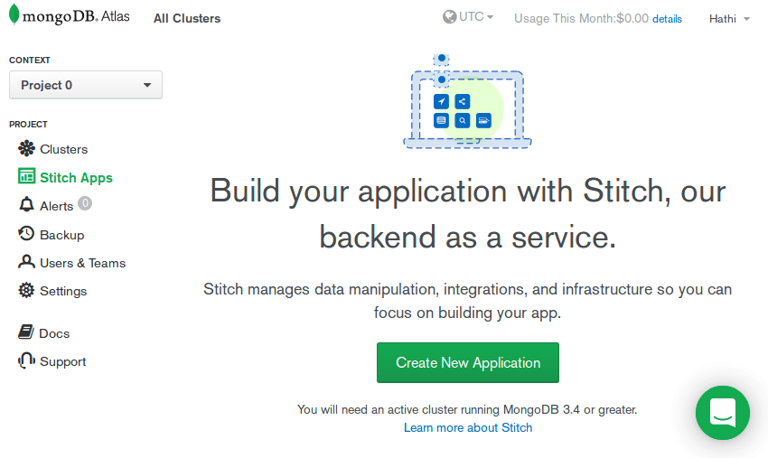 Now, login to MongoDB Atlas account and navigate to Stitch Apps section, as shown in the screenshot below.