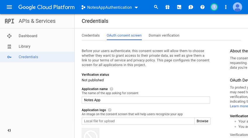 After the project gets ready, navigate to Credentials section and open the OAuth consent screen tab. Here, you need to fill Application Name field as shown in the screenshot below.