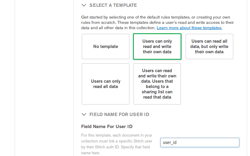 Now, select ‘Users can only read and write their own data’ rules template. It will align well with your app’s requirements.